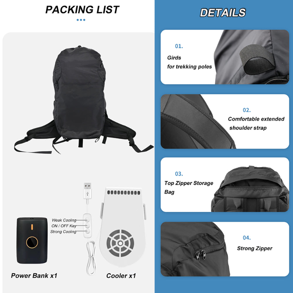 The CoolWear B10 Outdoor Air-Conditioned Backpack incorporates advanced semiconductor cooling technology, creating a fully circulating cool air environment within the backpack. The 10,000+ dense air vents on the back panel ensure effective cooling for the user. With a 30L capacity and ergonomic design, the backpack is lightweight and comfortable for extended wear.